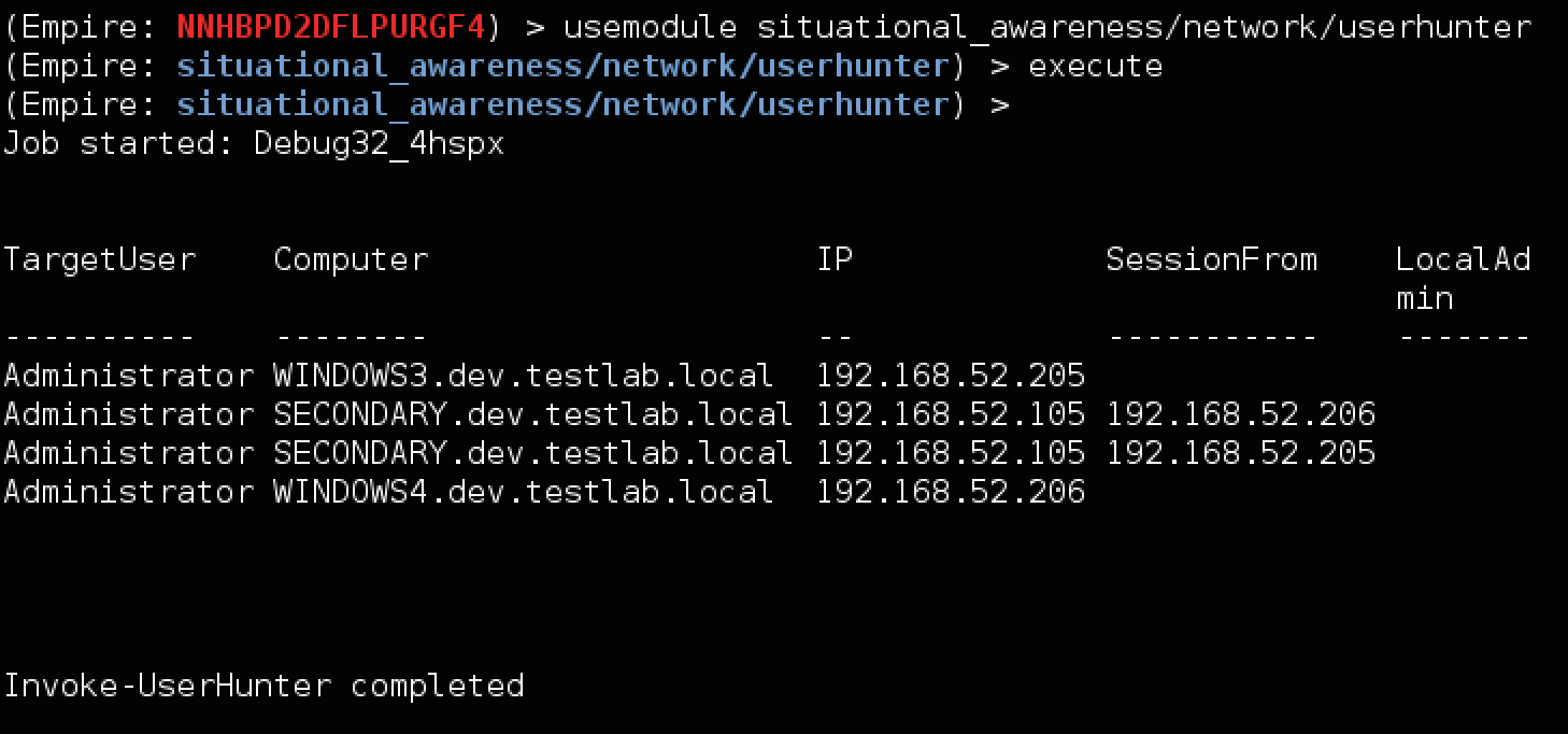 The situational_awareness/network/userhunter and situational_awareness/network/stealth_userhunter modules take this functionality one step further, and give you the ability to hunt for where target user sets are logged in on the network. Userhunter will enumerate every machine it finds, which will give you complete (but noisy) coverage. Stealthuserhunter will take a more subtle approach, by enumerating all likely file servers/domain controllers on the network and enumerating just the sessions against each. This gives you reasonable coverage and is both quieter and faster. For more information on user hunting, see the “I Hunt Sys Admins” post and accompanying presentation.